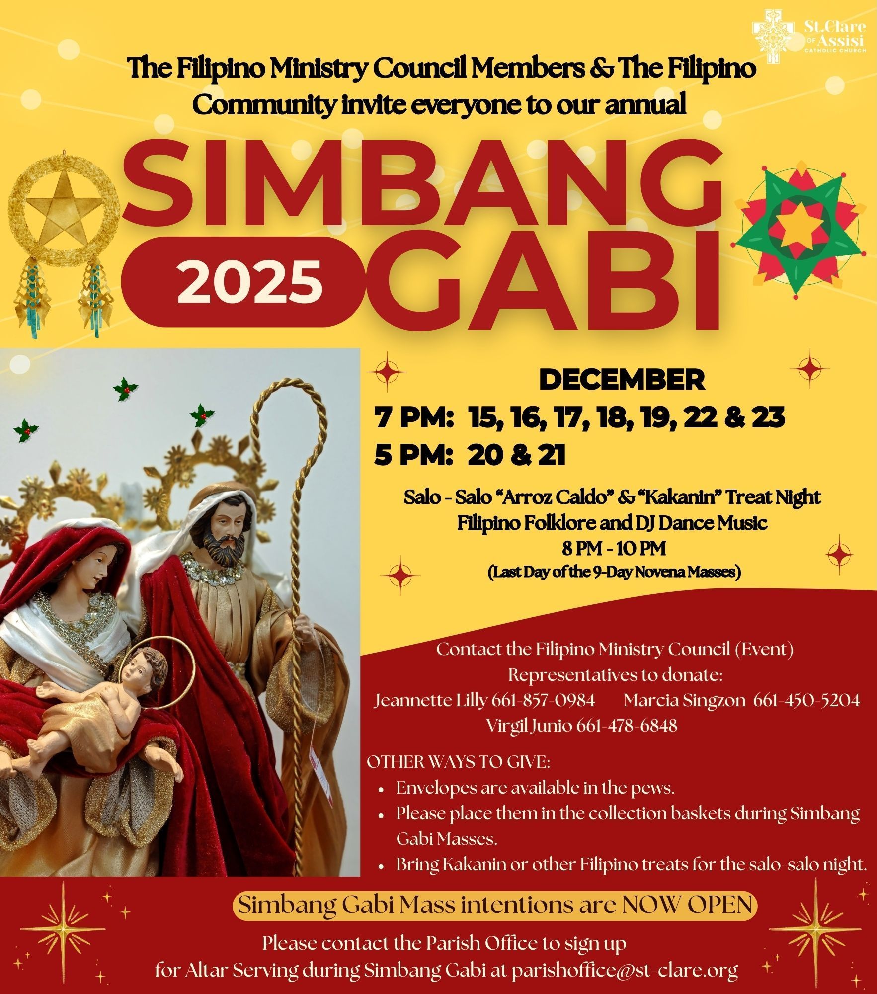 nine evenings of Simbang Gabi with us through prayer, song, and community. On the ninth evening, we’ll gather for a special fellowship and festive celebration to honor the journey we’ve shared. All are welcome—come and be part of this beautiful tradition of faith and unity!