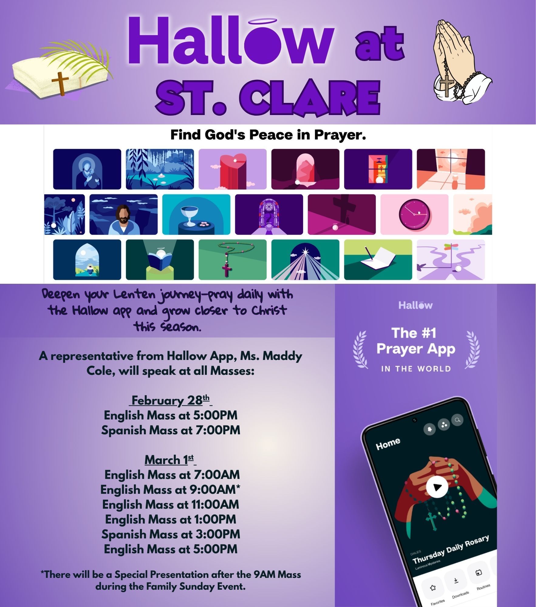 Additionally, a representative from Hallow, Ms. Maddy Cole, will speak at all Masses the weekend of February 28 to March 1