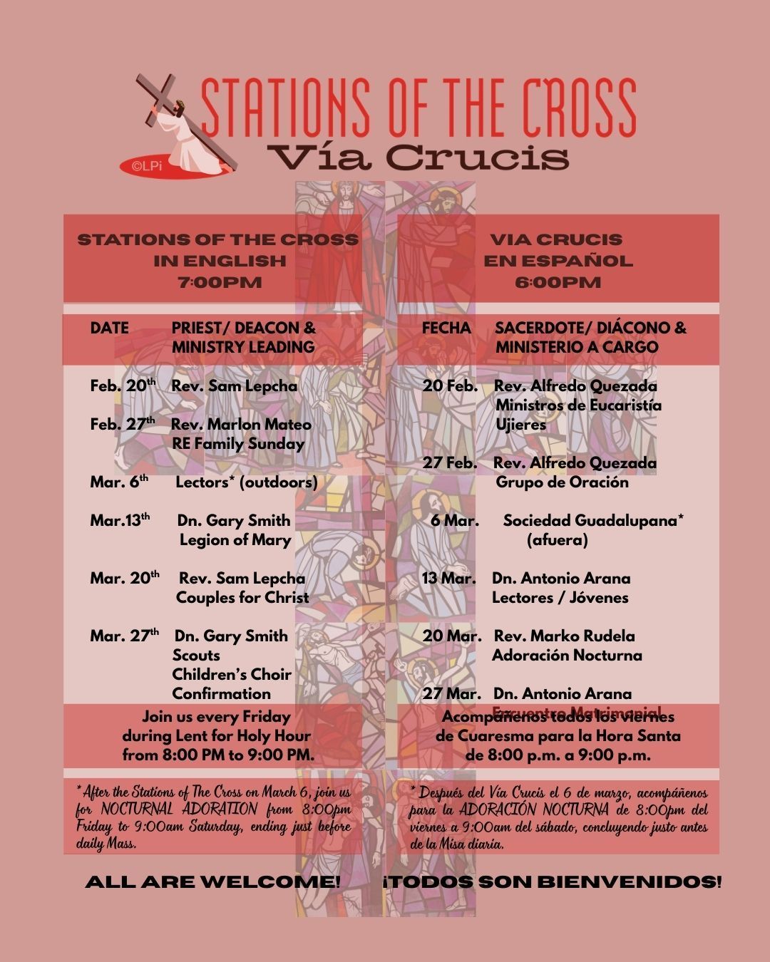 Join us every Friday evening for the Stations of the Cross: 6:00 PM Via Crucis (Spanish) and 7:00 PM Stations of the Cross (English). We conclude the night in quiet prayer before the Blessed Sacrament with Holy Hour from 8:00–9:00 PM. All are welcome to walk, pray, and reflect with our community