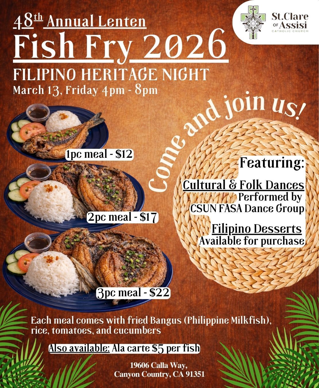 Join us on March 13 as we honor the rich traditions, flavors, and joyful spirit of our Filipino community. Enjoy a delicious Lenten meal, connect with friends and families from across the parish, and experience the warmth and hospitality that make this evening so special.