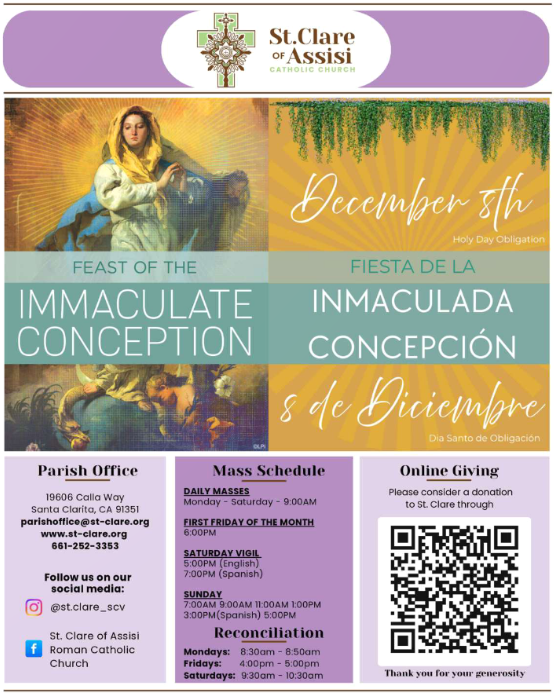 Celebre la alegría de la temporada en nuestro querido Mercado Navideño el sábado 14 de diciembre, de 8:00 a. m. a 4:00 p. m., en el Salón Parroquial. Disfrute de la diversión navideña, el espíritu comunitario y la oportunidad de apoyar su ministerio mientras recauda fondos para la Parroquia de Santa Clara.